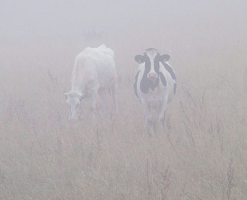 Verschwommen tauchen Kühe auf der benachbarten Weide aus dem Nebel auf.