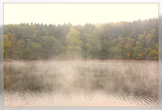 Nach einigen warmen Oktobertagen wurde es plötzlich empfindlich kalt. Das führte dazu, dass sich in der kalten Luft über dem wärmeren Stausee Nebelschwaden bildeten.
