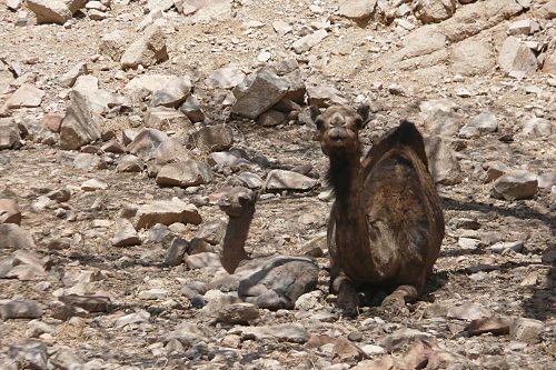 Ein Kamel mit einem etwa drei Tage alten Baby. Die Tiere weisen Brandzeichen auf und bewegen sich völlig frei.