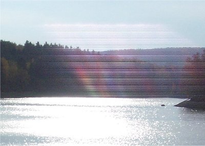 An der Steinbachtalsperre dann der erste Test des Programms "Sonnenuntergang". Mal vorausgesetzt, ich habe in meiner Unerfahrenheit die Einstellung richtig hinbekommen, ist die Streifenbildung links im Bild ein Fehler, den die Kamera verursacht. Noch habe ich keine Vorstellung, warum. Ein zweites Bild brachte den selben Effekt. |