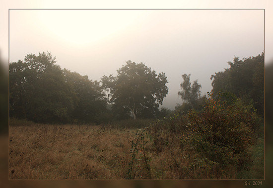 Mitte Oktober 2009: Es ist plötzlich kalt geworden. Nebel und Landschaft ergeben einen typisch grauen Herbstmorgen, doch die Sonne verspricht, noch herauszukommen. Also bestes Fotolicht.