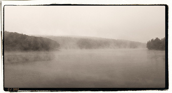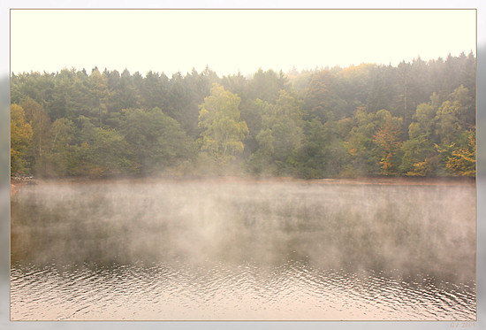 Das Wasser des Stausees ist deutlich wärmer als die Luft und dichte Nebelschwaden bilden sich über dem Wasser.