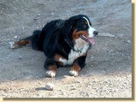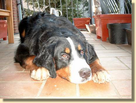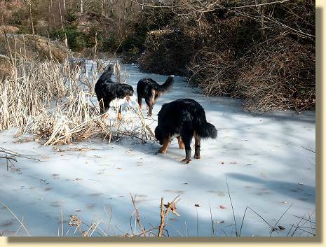 Wenn dem Berner zu wohl wird, geht er aufs Eis! Ist das ein schönes Gefühl, warmer Pelz und kalte Pfoten. Fast so schön wie schwimmen.