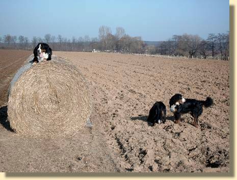Anton kann selbst auf die großen Strohballen springen. Für mich ist das nichts. Und selbst Domino muss passen. Das Weichei kommt "nur" auf die kleinere Ausgabe dieser Rollen drauf.