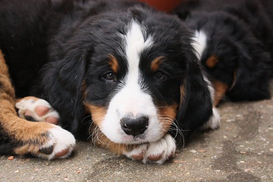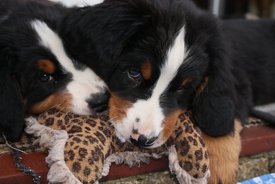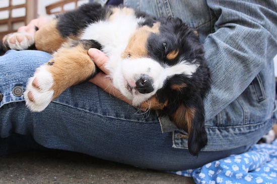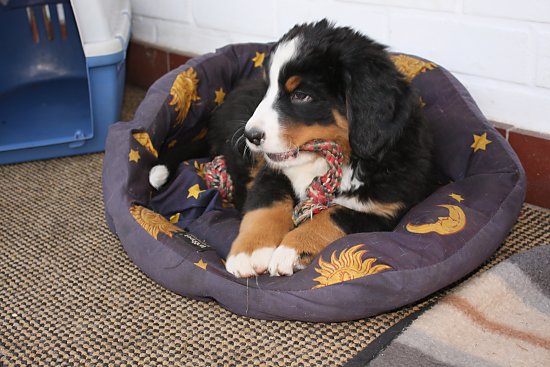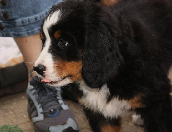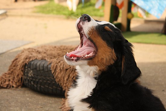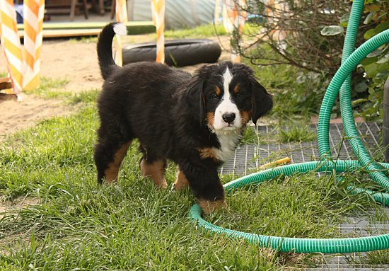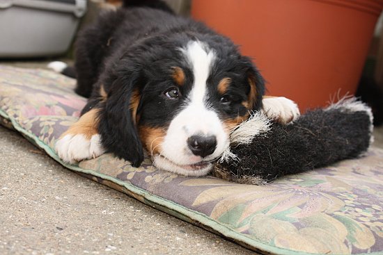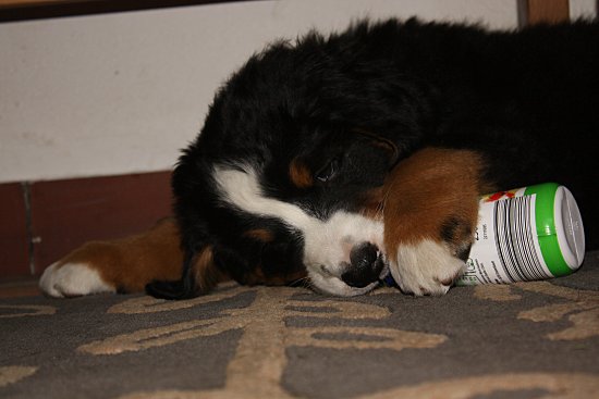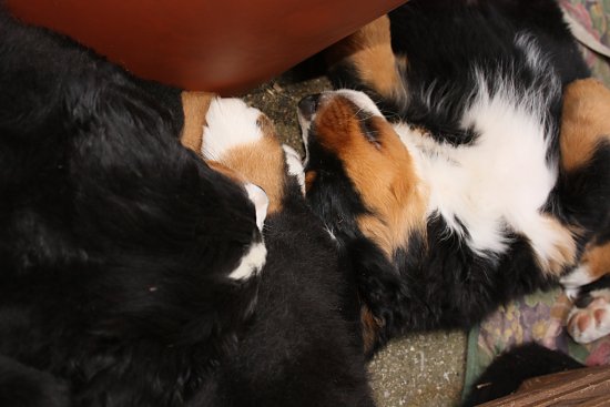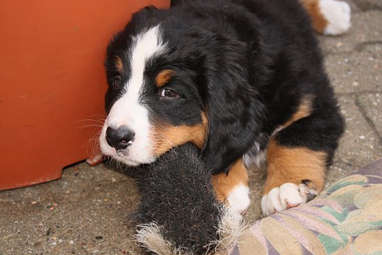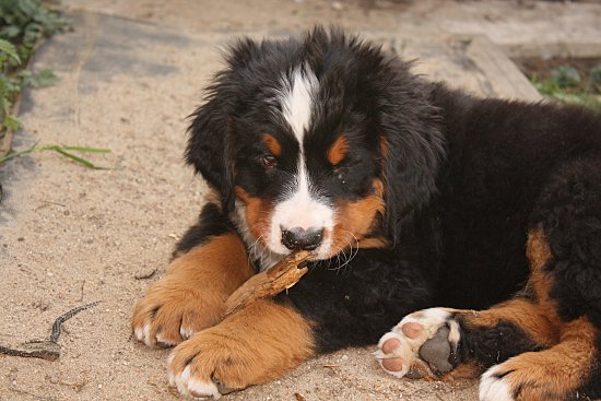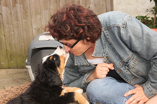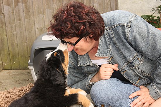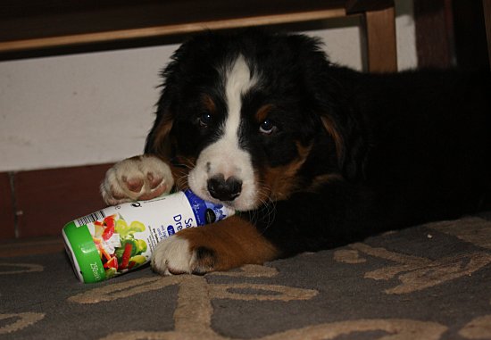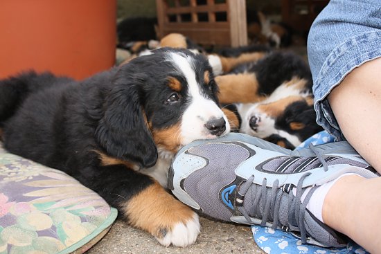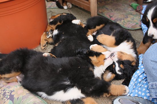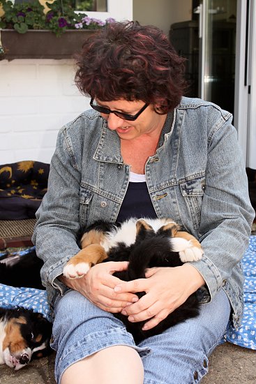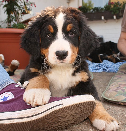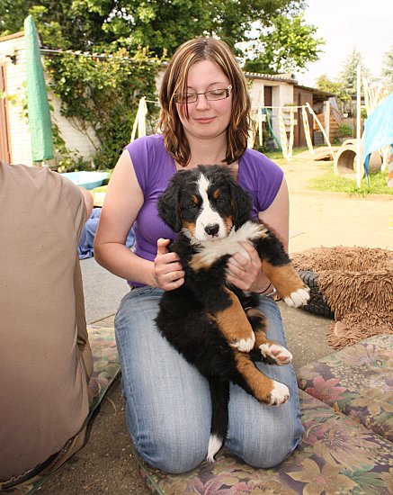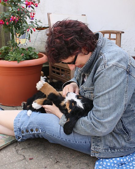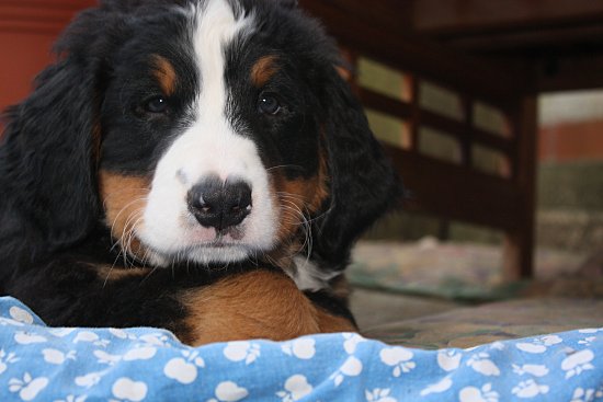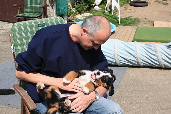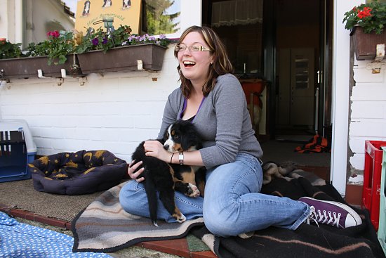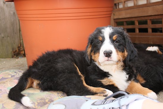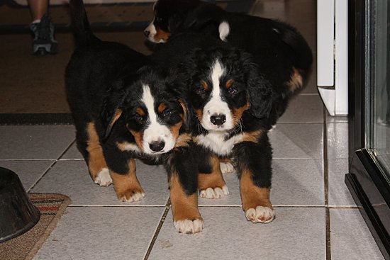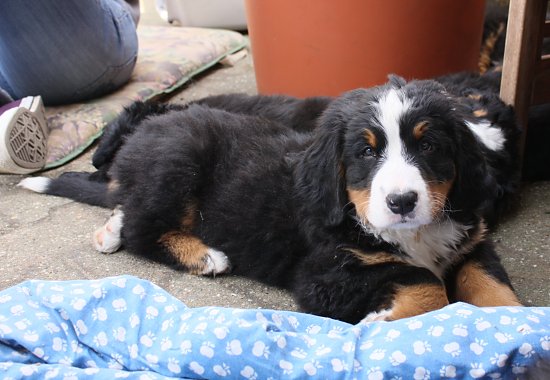 Von den großen Bernern habe ich auch schon eine ganze Menge gelernt. Zum Beispiel, an welchen Stellen im Haus man am meisten beachtet wird. Bestens geeignet sind dafür Türen und Durchgänge. Im Weg liegen funktioniert immer!