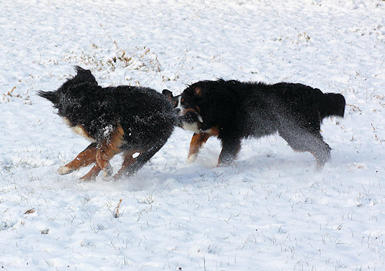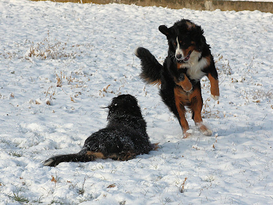 Seit Weihnachten liegt hier Schnee. Ginja hat darüber ja schon berichtet. Jetzt haben wir schon wieder Ende Januar und es schneit immer noch. Ich finde das klasse. Und Ginja ebenfalls. Aber eigentlich will ich euch von meinem verspäteten Weihnachtsgeschenk erzählen. Am 23.01.2010 packten mich Frauchen und Herrchen ins Auto und Ginja musste zu Hause bleiben. Dann sind wir lange gefahren und erst bei meinen Eltern wieder ausgestiegen. Haben die sich gefreut. Papa durfte ich zwar nicht sehen, dafür aber all die Mädels und natürlich Mama, mit der man schön spielen kann. Und dann rannte da noch so eine plüschige kleine Rennsemmel namens Duncan rum. Das ist ein Halbbruder von mir, hat also den selben Papa. Aber irgendwie sah der Kleine seltsam aus. Zu heiß getrocknet und einen riesigen Pelz am Leib. Dazu sehr frech und auch noch schnell auf den Beinen.