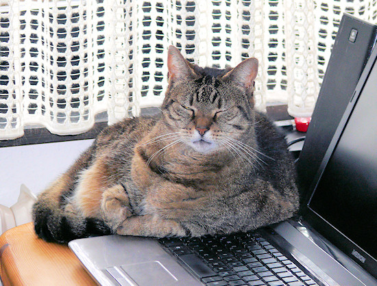 Das heiße Gebläse meines Notebooks hatte es ihr immer angetan. So, wie hier 2013, lag sie oft bei mir und störte mich bei der Arbeit.