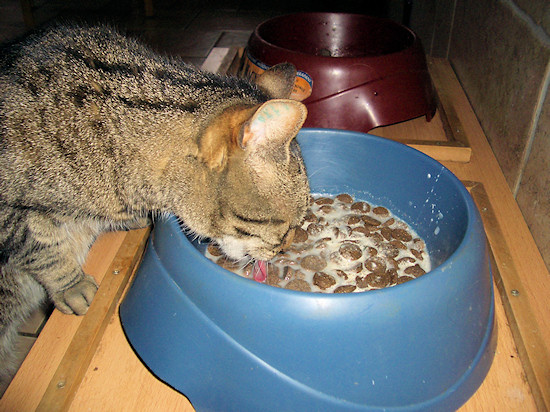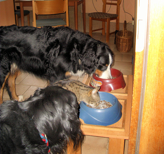 Chelsea war immer Chefin im Bernerland. Wenn sie an den Hundenapf wollte, dann hatten die Hunde zu warten! Hier 2006 mit Domino und Ginja.