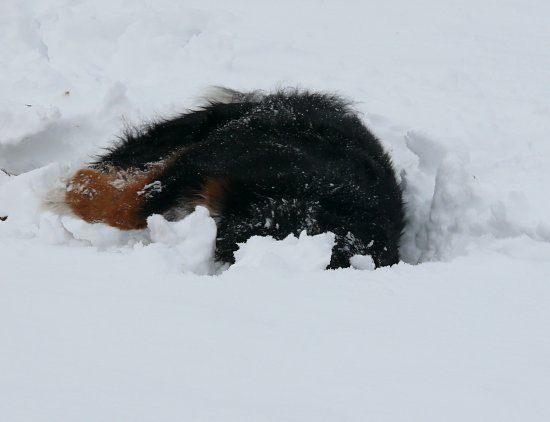während Ginja mit ihren kurzen Beinchen den Schnee unter ihrem Bauch eher mit gemischten Gefühlen betrachtete.