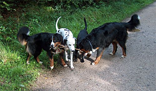Ich bin froh, dass Frauchen eingesehen hat, dass es keinen Sinn hat, mich in irgendwelche Hundeschulen zu schleppen. Hat mich jedenfalls ordentlich viel Arbeit gekostet, sie hiervon zu überzeugen. Dafür nimmt sie immer Ginja mit, der das wenigstens Spaß zu machen scheint. Und ich habe endlich meine Ruhe. Denkste! Figo, den schimmeligen Fehlfarbenberner, manchmal auch Pünktchen genant, kennt Ihr ja. Dass ist der Dalmatiner von Herrchens Schwägerin Iris. Und das ist ein furchtbarer Hektiker. Der hat so gar nichts von einem Berner Sennenhund an sich. das wir ab und zu zusammen spazieren gehen, ist ja schon in Ordnung. Immerhin kann er dann mit Ginja rumtoben und ihr dabei auf die Nerven fallen. Aber jetzt? Jetzt hat er sich tatsächlich auf Dauer hier bei uns zu Hause einquartiert! Herrchen sagt zwar, dass das nur für zwei Wochen ist. Aber wisst Ihr eigentlich, wie lang zwei Wochen sein können? Die ersten Tage waren echt furchtbar. Dann wurde es ein wenig besser. Aber schaut selber: