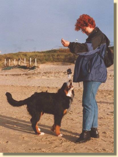 Anton mit Frauchen links, Domino mit Frauchen rechts