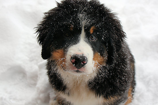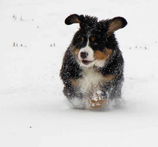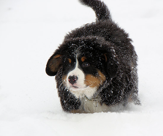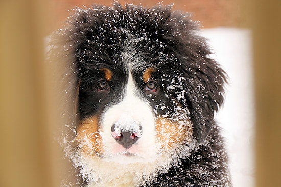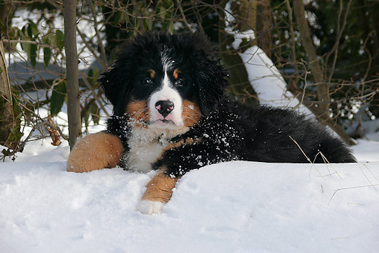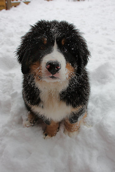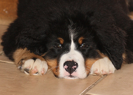 Unser Berner Sennenhundwelpe Duncan liegt im Flur und langweilt sich sichtlich. Draußen liegt jede Menge Schnee und da möchte er hin.