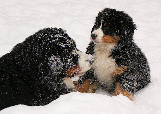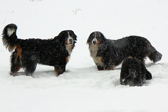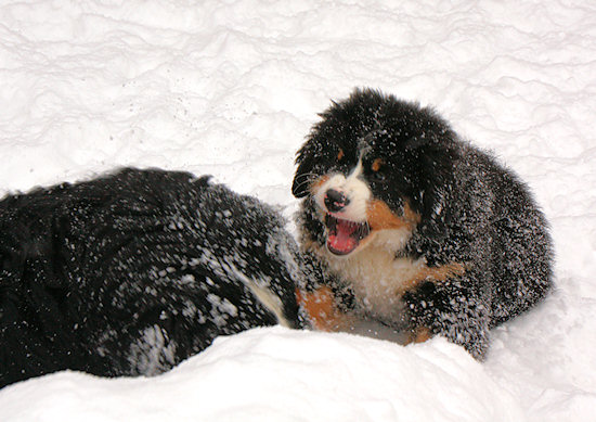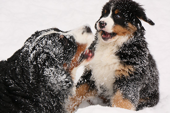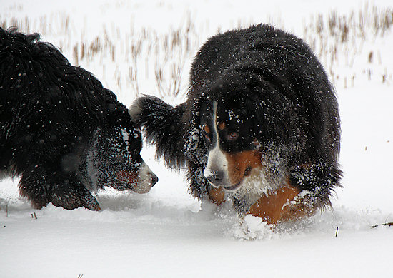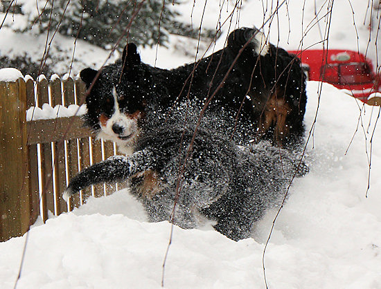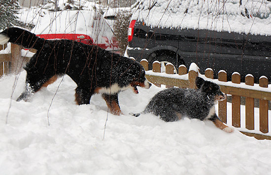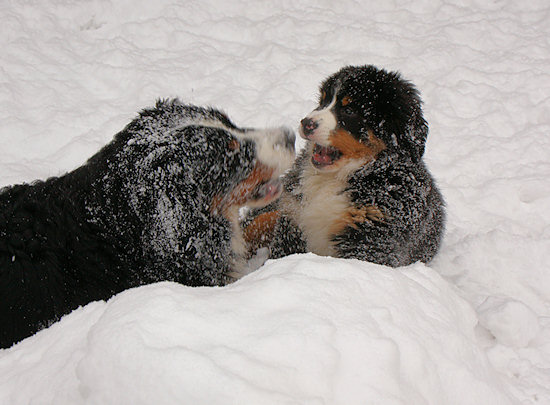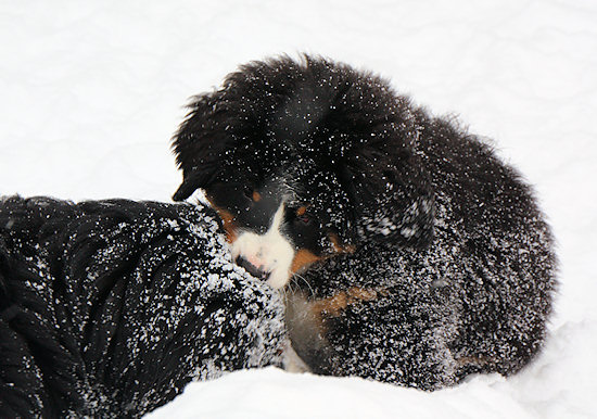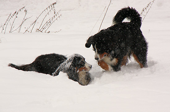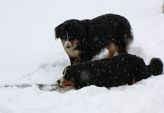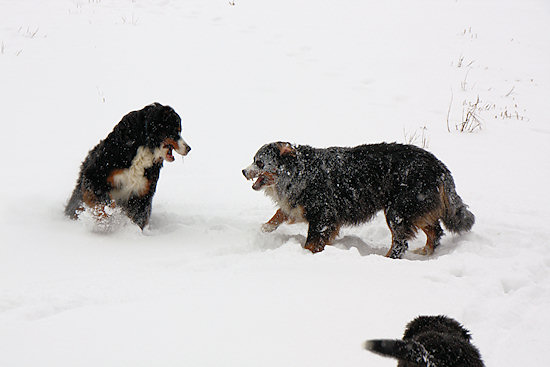 Camillo startet schon wieder eine Attacke auf Ginja, die sich viel lieber in Ruhe im Schnee wälzen würde.