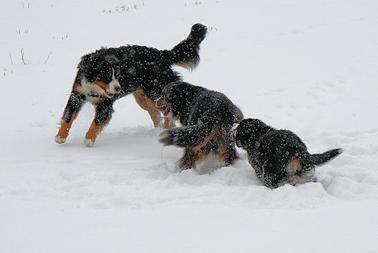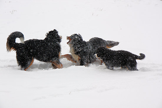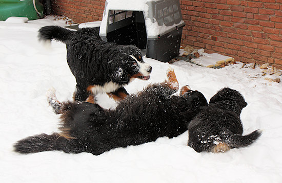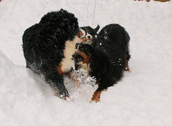 Die beiden anderen Schneebären lassen sich auch nicht lange bitten und so geht die Toberei los.