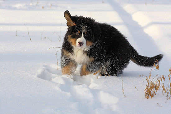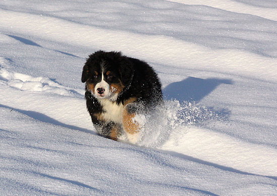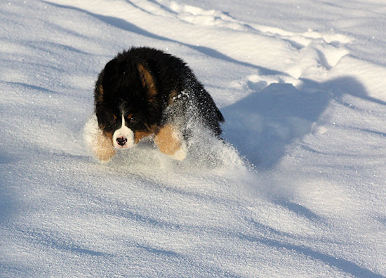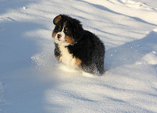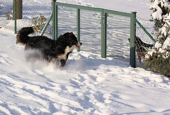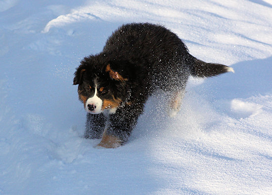 Über Nacht sind gut 10 cm Pulverschnee gefallen. Duncan muss schon fast durch den Schnee pflügen, weil seine Beine zu kurz für normales laufen sind.