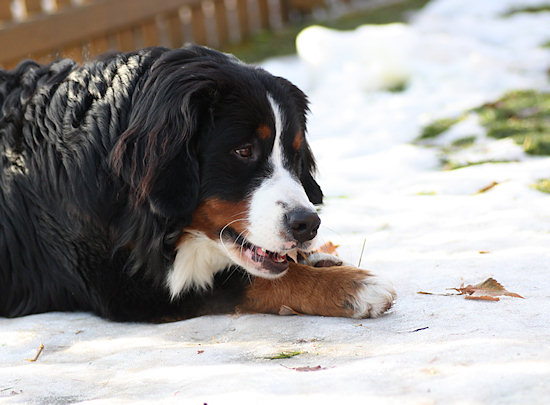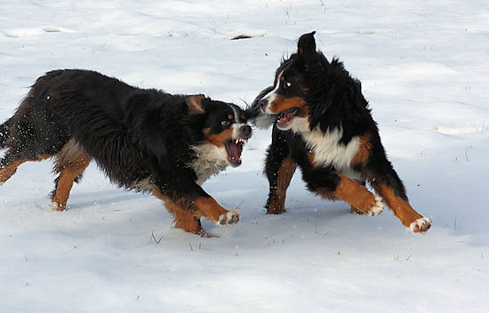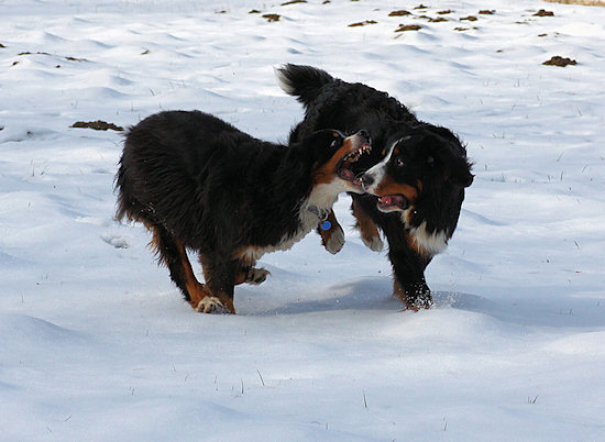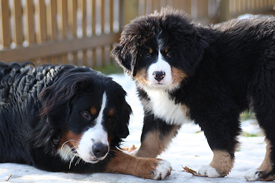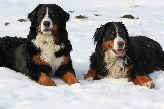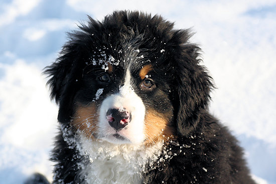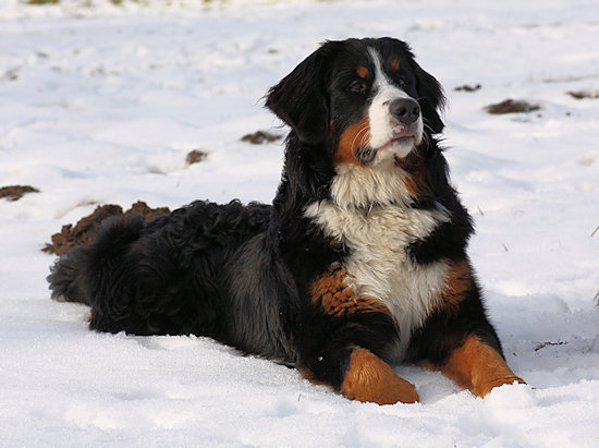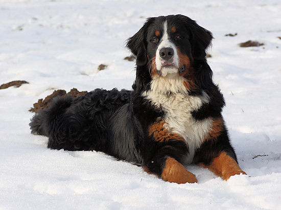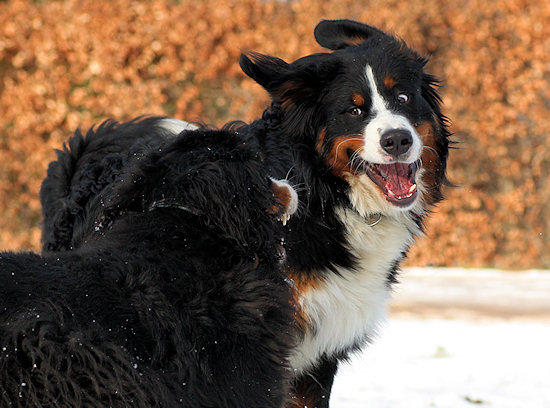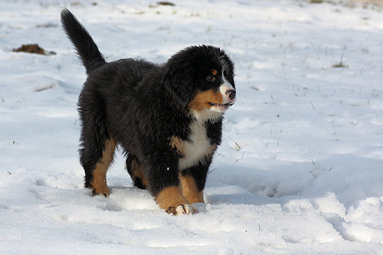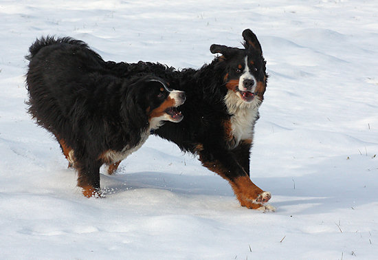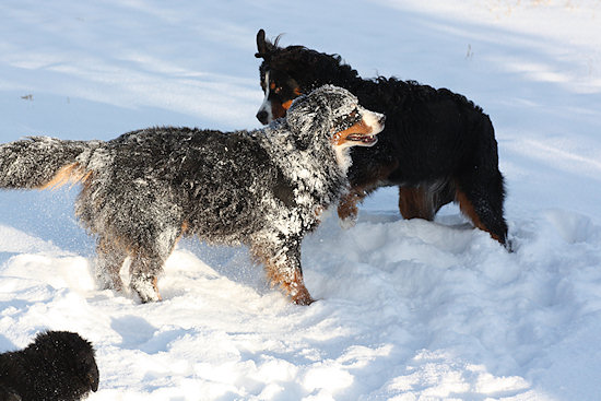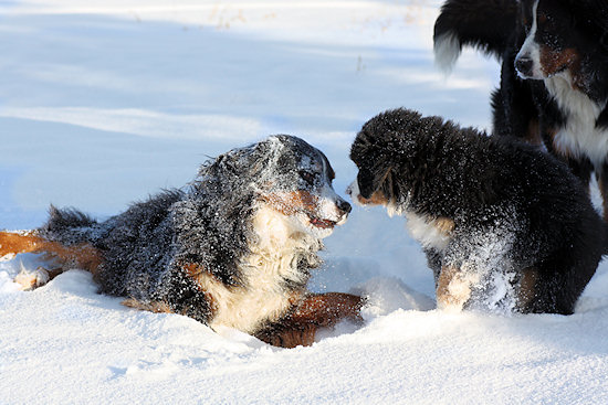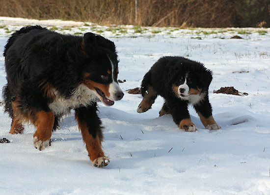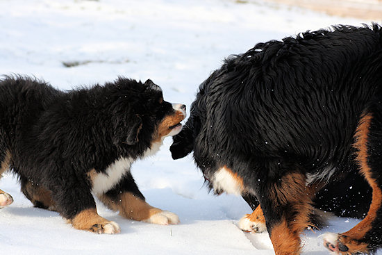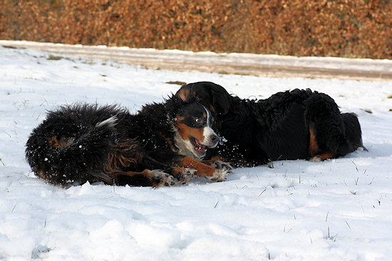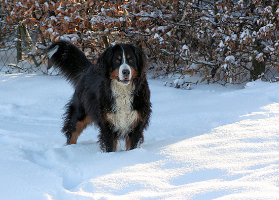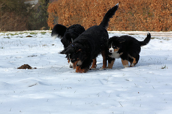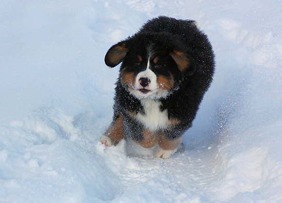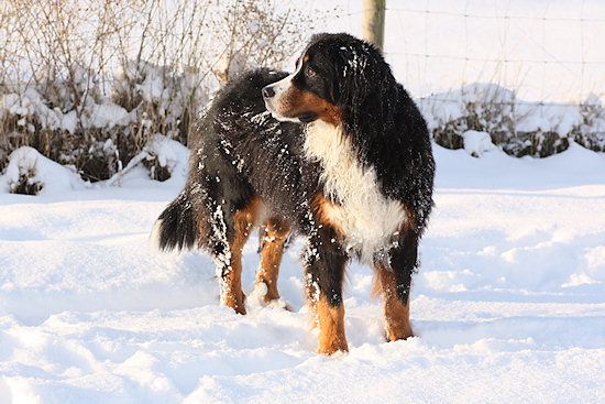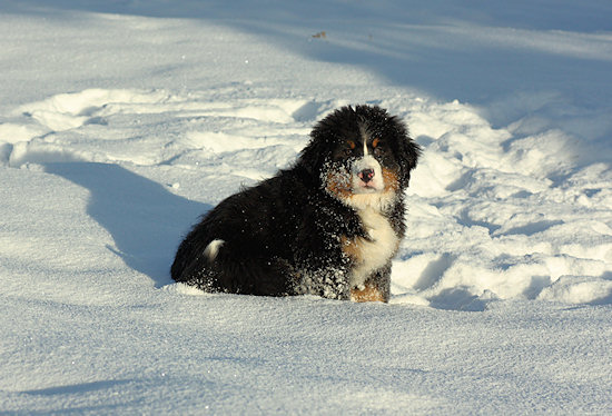 So sieht also ein Berner aus, der sich gerade im Schnee gewälzt hat. Duncan schaut sich das noch etwas ungläubig an. Aber das ist tatsächlich Tante Ginja.