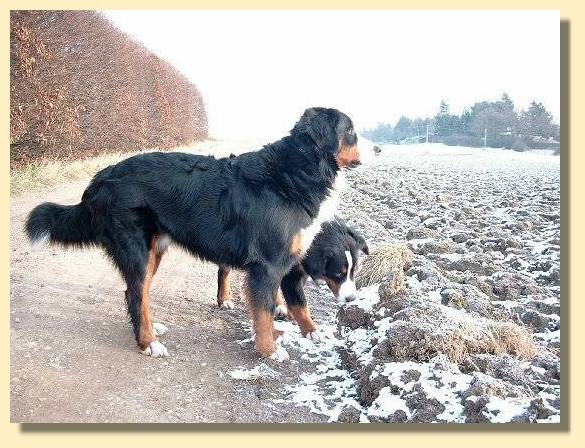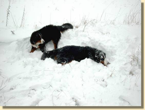 Dann wurde es so richtig kalt und alles wurde draußen weiß. Das hat Spaß gemacht! Unsere Zweibeiner fanden das auch toll und hörten auf, zu hause hinter uns herzuputzen.
