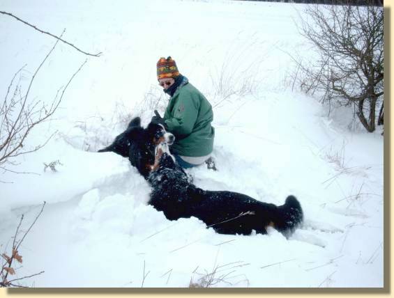 Und tatsächlich: Ende Januar schneite es dann noch mal ganz ordentlich. Sonntags (02.02.2003) sind Frauchen und Herrchen dann mit uns in die Eifel gefahren, wo noch mehr Schnee lag. An den Wegrändern war besonders viel von dem weißen Zeug, Herrchen nannte es "Schneewehen".