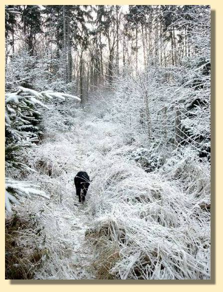 Domino kannte das weiße Zeugs schon, dass dort so spärlich auf dem Weg lag. Er fand es zwar auch schön, meinte aber, davon hätte er schon mal viel mehr gesehen.