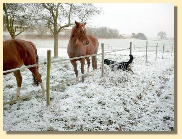 Die Pferde auf der Koppel wollten unbedingt mit mir um die Wette laufen. Vor lauter Freude sind sie in die Luft gesprungen und haben ganz doll mit den Beinen um sich geschlagen. War das eine Rennerei! Ich war immer schneller, weil ich besser um die Ecken laufen kann. Dabei hat Herrchen die ganze Zeit laut nach mir gerufen. Das verstehe ich gar nicht. Wo dieses Spiel doch so schön war. Jetzt nimmt Herrchen mich immer an die Leine, wenn ich Pferde sehe. Spielverderber!