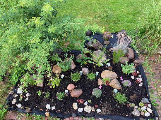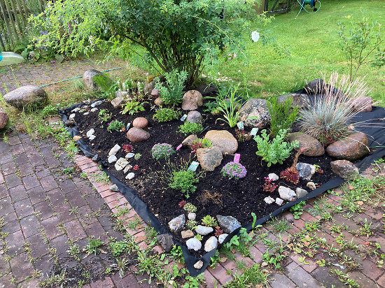 Dazu mussten zunächst alle Steine und eine, wie sich beim Ausgraben zeigte, ziemlich große Waschbetonschale, entfernt werden. Dabei wurde auch sämtlicher Bewuchs ausgemacht und, soweit noch verwendbar, zur Seite gelegt. Der Untergrund entpuppte sich als Lavahügel und wurde beibehalten. Darauf kam ein verrottbares Unkrautvlies und darauf Blumenerde. Und hierauf wurden einige Steine platziert, so dass sich ein gefälliges Bild ergab. Da hinein kamen dann neue Bodendecker und wenige alte der noch brauchbaren Pflanzen. Inzwischen blüht davon schon so einiges. Perspektivisch soll das Ganze zusammenwachsen und den Boden ganz bedecken. Dabei sollen die Steine natürlich sichtbar bleiben, sonst wäre es ja kein Steingarten mehr. Im Vergleich zu vorher, wo Stein an Stein lag, ist es so sehr viel luftiger und auch interessanter anzusehen. Weniger ist halt oft mehr.