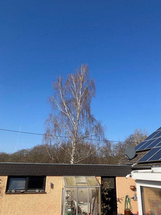 Nach einer Reihe von kurz aufeinanderfolgenden Stürmen Mitte Februar 2022 (Ylena, Zeynep, Antonia) stand die große Birke am Haus leicht schief. Anders ausgedrückt, es bestand die, wenn auch eher geringe, Gefahr des Umkippens. Also haben wir sie kappen lassen.