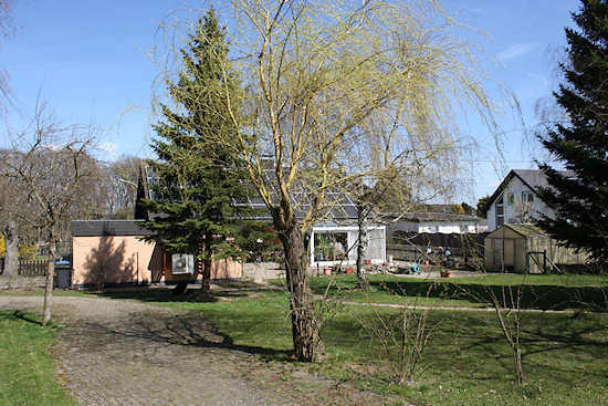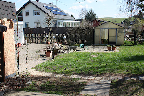 Ein Überblick über die Terrasse mit Blick auf den Steingarten. Links sieht man das alte Gewächshaus. Die Aluminiumkonstruktion ist in Ordnung, aber die Kunststoffstegplatten sind hin.