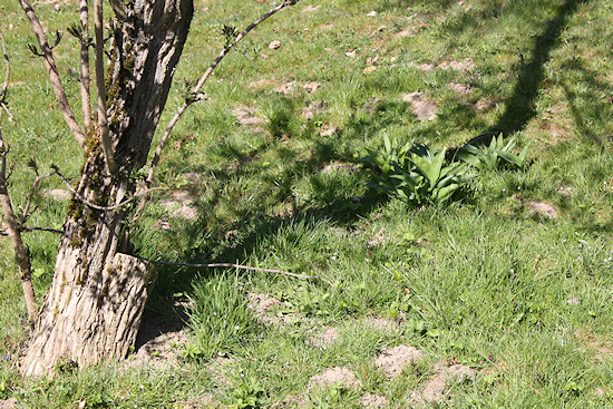 Eine "Gierschplantage". Das Kraut kann man essen, was wir auch probiert haben. Ein kulinarischer Genuss ist damit aber nicht verbunden, abschreckend ist es aber auch nicht. Allerdings wuchert das Zeug dermaßen, dass es kaum in den Griff zu bekommen ist. Vertreiben lässt es sich schon mal gar nicht. Da hilft nur mähen. Wenn wir großes Glück haben, kämpft sich der Bärlauch bis dahin vor und nimmt uns die Arbeit ab. Bärlauch ist auch deutlich leckerer.