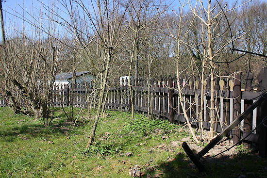 Hier stehen links meine Johannisbeeren und vor den Thuja eine Stachelbeere und dahinter noch mal zwei Beeren. Langsam entwickelt sich ein "All you can eat- Garten". Der junge Baum vorne ist eine Mirabelle "Von Nancy", die im letzten Herbst das erste Mal Früchte getragen hat. Und dann gleich so viele, dass die Äste sich bogen und angebunden werden mussten. Gesetzt haben wir sie im Frühjahr 2011 zusammen mit den anderen Obstbäumen. Sie hat also 3 Jahre bis zum ersten Ertrag gebraucht. Dahinter steht die Birne (Sorte "Williams Christ"), die leider immer wieder vom Birnenrost befallen wird. Gleiches gilt für den älteren Birnbaum, der schon beim Hauskauf dort stand.