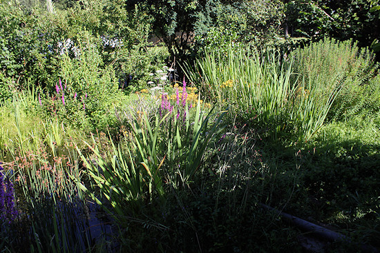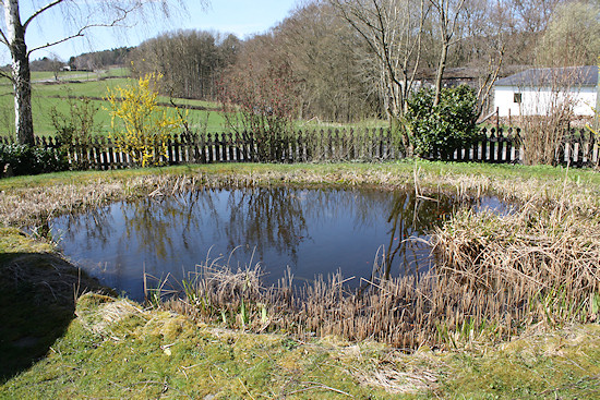 Der Bärlauch mit dem Holunder, im Hintergrund der Gartenteich.