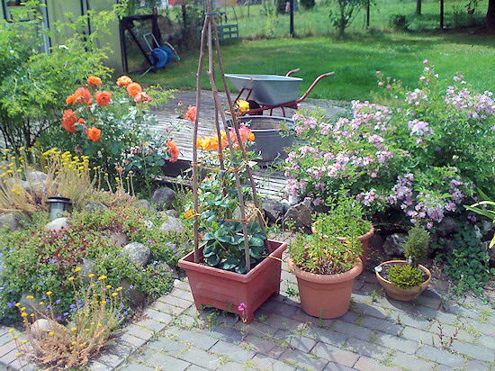 Jede Menge Töpfe und Kübel bevölkern die Terrasse.