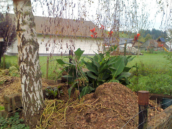 Nach den Erfahrungen mit dem Pferdemist benutzen wir jetzt unseren eigenen Kompost, der in zwei Kammern reifen kann. Der Mist war ohnehin nur eine Übergangslösung, weil wir ja anfangs noch gar keinen Kompost hatten. Hier auf dem Bild ist die vordere Kompostierkammer leer geräumt und nur das Blumenrohr ist übrig geblieben. Ob es auch in diesem Jahr noch einmal wächst, müssen wir abwarten.
