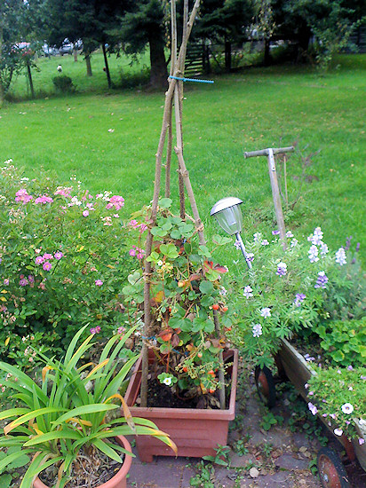 Klettererdbeere im Kübel.