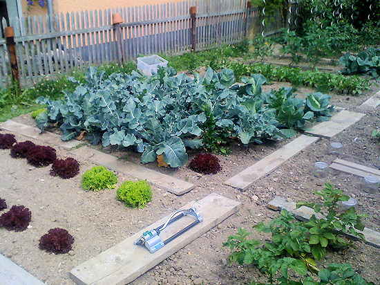 Salate und Kohl, hinten stehen Tomaten. Der Rasensprenger ist mit der Zisterne verbunden und dient der bequemen Bewässerung.