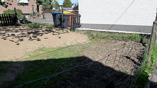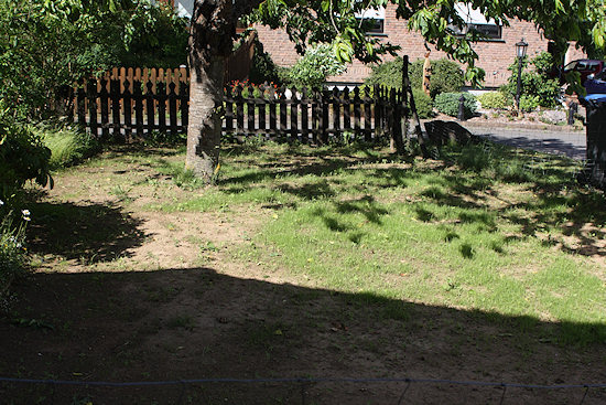 Und da nun einmal Mutterboden geordert werden musste, durfte es auch etwas mehr sein. Mehr heißt ca. 14 - 15 Tonnen, also einen vollen Dreiachser Material, dass ich dann mit der Schubkarre in den Vorgarten fahren durfte. Dort unter unserem großen Süßkirschbaum war vom Vorbesitzer aus einem unerfindlichen Grund das Terrain zum Nachbarn bis gut 45 cm abgesenkt worden. Diese Senke habe ich also aufgefüllt und ebenfalls neu angesät. Zugleich habe ich die Heckenrosen bis zum Boden abgeschnitten, damit ich auch dort ein ebenes Gelände schaffen konnte. Ob ich die Rosen mit dem Rasenmäher weiterhin kurz halte, oder ob sie wieder wachsen dürfen, weiß ich noch nicht.