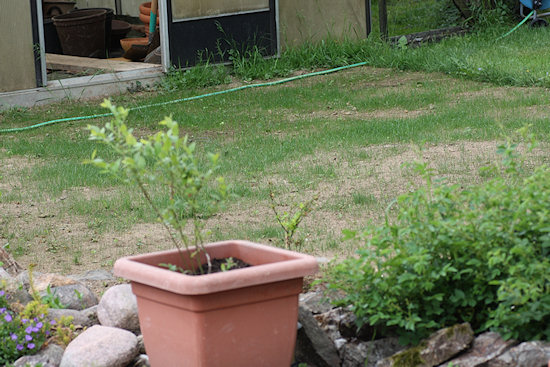Dort, wo vorher eine Holzterrasse war, habe ich jetzt Mutterboden angefüllt und Rasen gesät. Der Steingarten wurde dabei ebenfalls hergerichtet und teilweise neu aufgefüllt, nachdem uns die Mäuse dort ziemliches Durcheinander hinterlassen hatten. Eine Blaubeere, die angeblich auf normalem Gartenboden wachsen soll, wurde vor dem Steingarten platziert. Ein Halbkreis aus Kopfsteinpflastersteinen bildet eine optische Abgrenzung zum Rasen. Dabei sind die Steine Bodeneben gesetzt, damit sie beim Rasenmähen nicht stören.