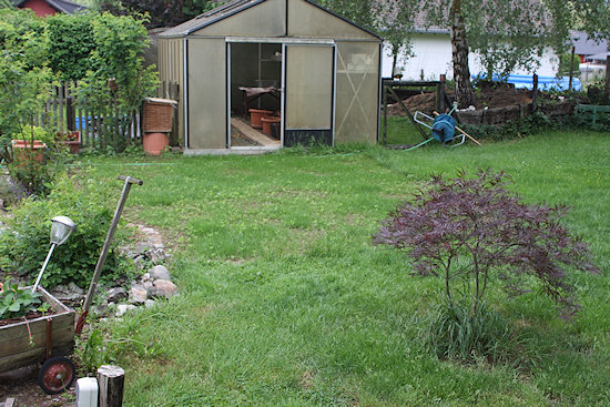 Hier hat einmal das blaue Gartenhaus gestanden. Im Mai 2017 habe ich die morsche Holzterrasse vor dem Gewächshaus entfernt und mit Mutterboden aufgefüllt.