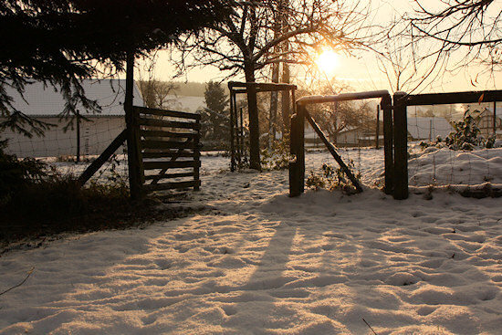 Am Donnerstag, dem Tag vor Heilig Abend gab es andauernden Eisregen. Fahren oder auch nur gehen wurde zu einem unkalkulierbaren Abenteuer. Danach fiel wieder reichlich Pulverschnee, so dass alles unter einer dicken Schneedecke verschwand. Und irgendwo mitten in dem Schnee liegt eine zentimeterdicke Eisschicht.