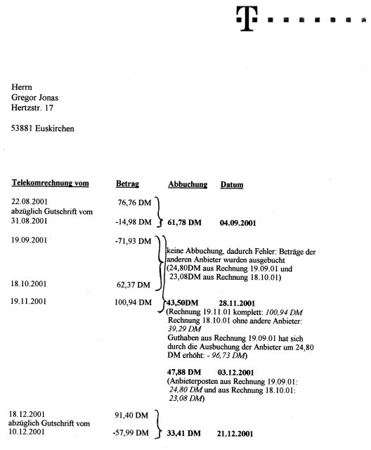 Bemerken möchte ich auch noch, dass Frau Eichler mich bereits am 14.01.02 telefonisch kontaktiert hat, um mir den Sachverhalt zu erklären. Bleibt die Frage, warum die Telekom nicht immer gleich so reagiert und immer erst massiv unter Druck gesetzt werden muß.