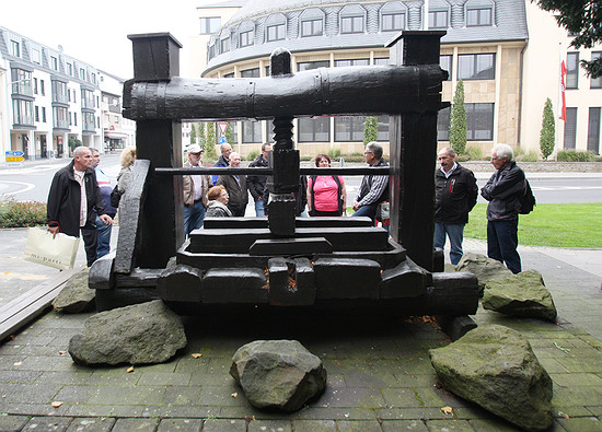 Eine alte Traubenpresse steht neben dem
