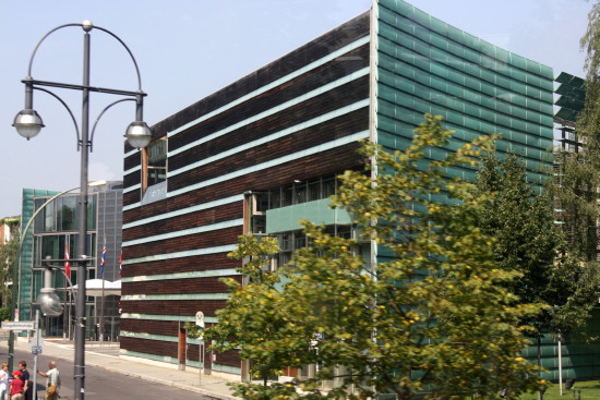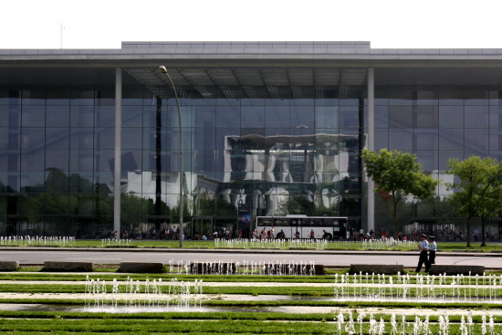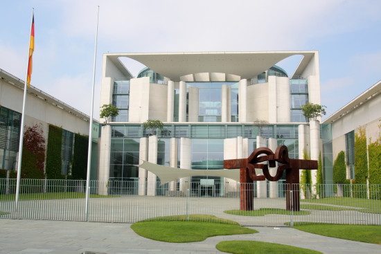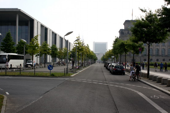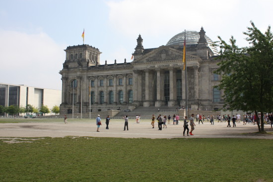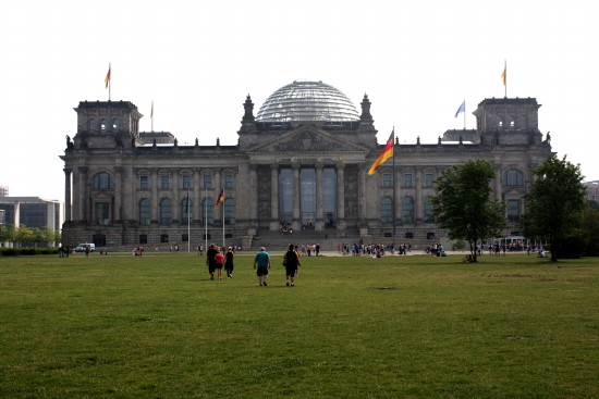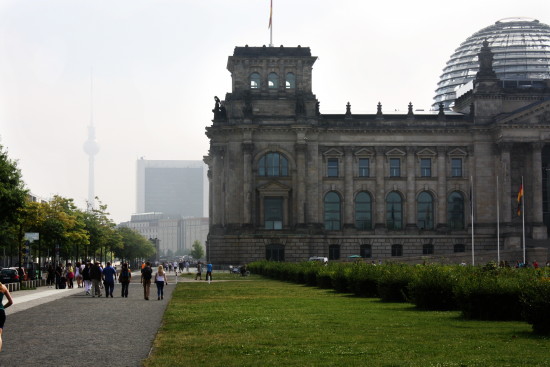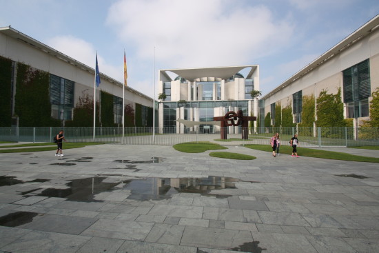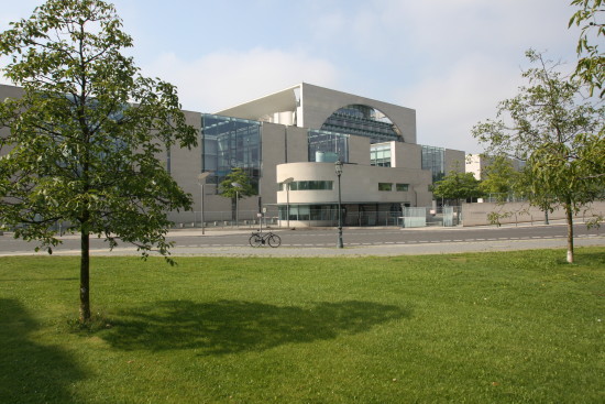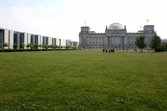 Vom Kanzleramt sind es nur wenige Schritte zum Reichstagsgebäude mit der berühmten Glaskuppel. Links das Gebäude für die Abgeordneten und die Fraktionen, in dessen Fassade sich in den beiden vorherigen Fotos das Kanzleramt gespiegelt hat.