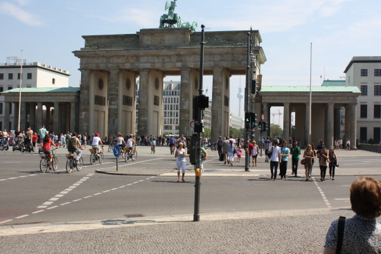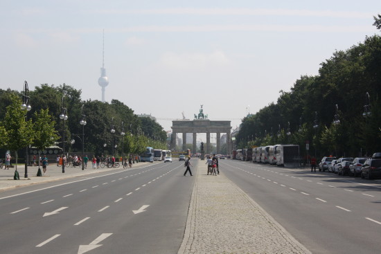 Die Rückseite des Brandenburger Tors. Von dieser Blickrichtung aus liegt der Reichstag links.