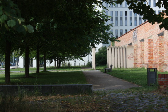 Nach der Gartenanlage kommt man an der Mauer des Geschichtsparks "Ehemaliges Zellengefängnis Moabit" vorbei.