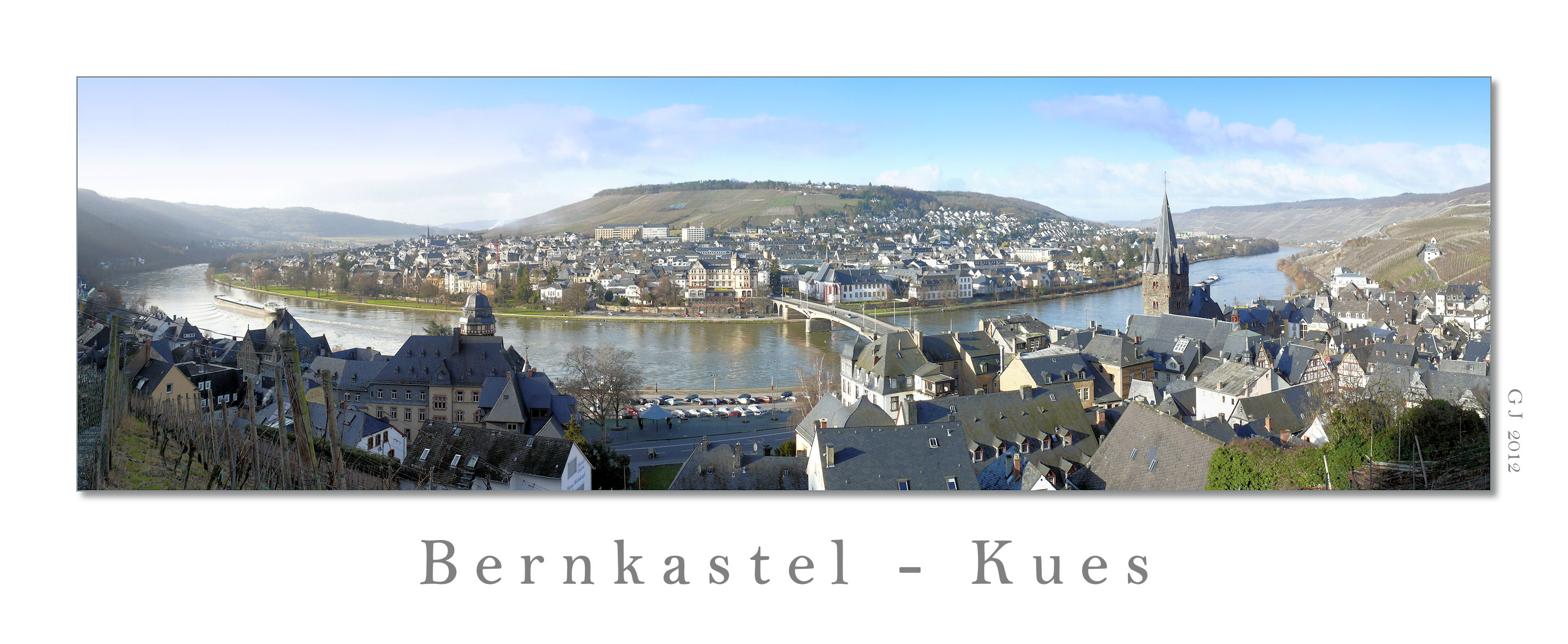 Bernkastel-Kues besteht aus den beiden Stadtteilen Bernkastel und Kues (welch Überraschung), die durch die Mosel getrennt werden und durch eine Brücke miteinander verbunden sind. Beidseits der Mosel ziehen sich ausladende Weinberge entlang. Hier von der Kueser Seite aus die Brücke entlang Richtung Bernkastel fotografiert.