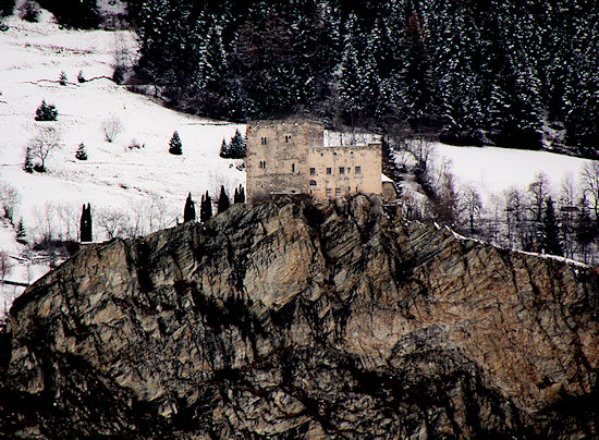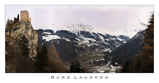Gegenüber von Fiss liegt auf der anderen Talseite Fendels. Von dort aus hat man einen schönen Blick auf die Burg Laudegg. Aus dieser Perspektive ist es kaum zu glauben, dass dahinter ein ziemlich großer Dorfteich verborgen liegt.