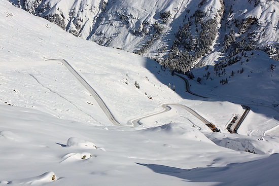 Zum guten Schluss waren wir noch einmal in Samnaun, hatten aber wieder kein Glück mit dem Wetter. Es war neblig und wolkenverhangen, Das Einzige, was zeigenswert ist, ist der Verlauf der Straße. Es gibt davon zwei, die von der B180 hinter Pfunds innerhalb von weniger als 50m abgehen. Die offenbar ältere, längere und schönere ist die von Pfunds aus gesehen hintere. Teilweise sind Abschnitte grob in den Fels gesprengt worden, unbeleuchtet und einspurig, so dass man sich darauf verlassen muss, das der Gegenverkehr von oben einen sieht und wartet. Das Feeling innerhalb des Tunnels hat etwas von einer Geisterbahn an sich, ist aber vielleicht gerade deshalb besonders reizvoll. Die neuere Straße bietet bei weitem nicht dieses Gefühl von Abenteuer und auch die schlechteren Ausblicke, ist dafür kürzer, besser ausgebaut, aber auch deutlich steiler.