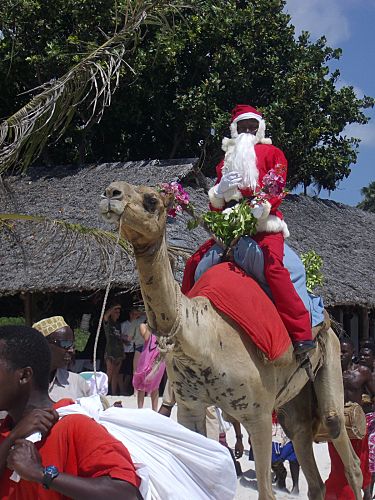 Am ersten Weihnachtstag dann kam auch noch der Weihnachtsmann an den Strand, standesgemäß in rotem Mantel und mit weißem Bart auf einem Kamel reitend (worauf auch sonst).