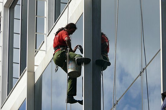 Wieder unten angekommen erhalten wir einen Eindruck von den Arbeitsbedingungen der heimischen Fensterputzer. Ob das mit den hiesigen Berufsgenossenschaften möglich wäre?