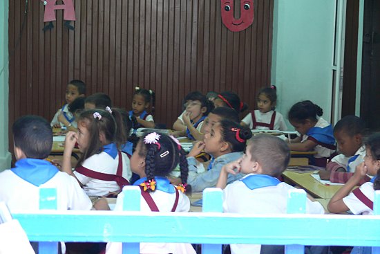 Eine Grundschulklasse, völlig ungestört vom Betrieb jenseits des offenen Fensters.
