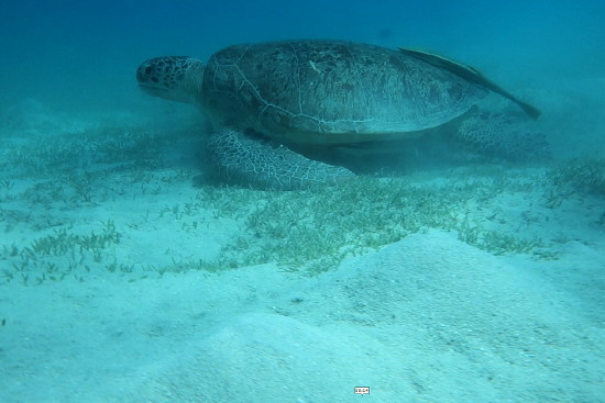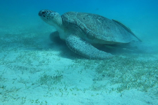 Echte Karettschildkröte. Eine Hauptnahrung sind neben Seegras Schwämme.